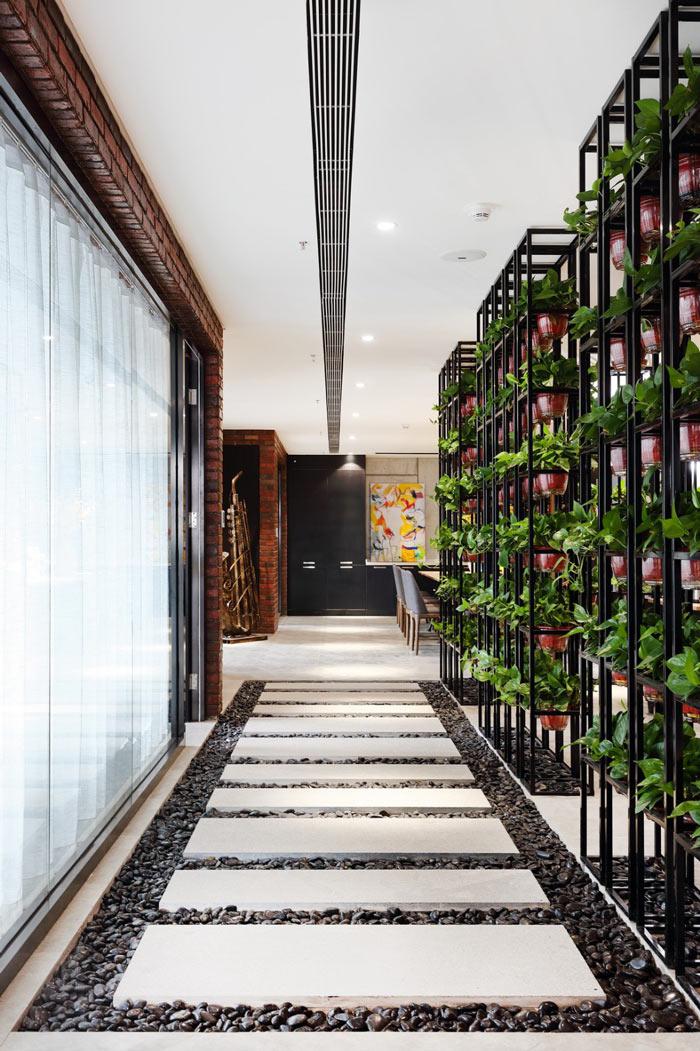 過道設(shè)計師將其設(shè)計成漫步區(qū),漫步區(qū)與綠植區(qū)結(jié)合在一起,為空間打造了一處觀賞區(qū),讓員工在這里放松心情、忘卻煩惱。